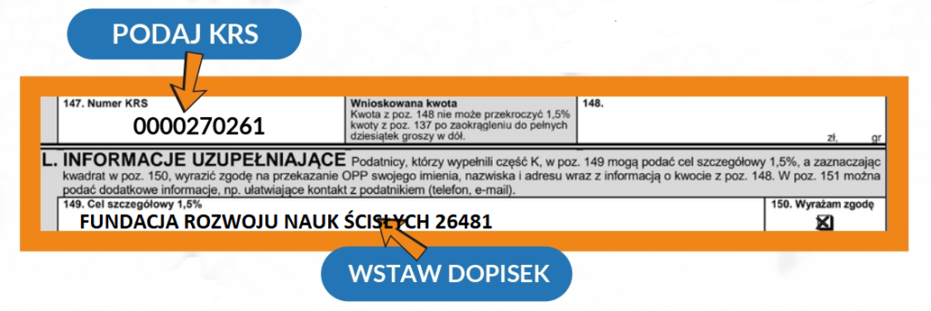 - WAŻNE! W kolejnym polu „Cel szczegółowy 1,5%” należy wpisać FUNDACJA ROZWOJU NAUK ŚCISŁYCH 26481.